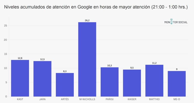 Coincidentemente, Pablo Beytía, profesor de ciencia social computacional en la U. Católica y director de Monitor Social, plataforma de análisis social en tiempo real, dice que entre las 21 horas del miércoles y la 1 de la mañana del jueves, Mayne-Nicholls fue el que generó más consultas en Google, con más de un cuarto de las búsquedas efectuadas en esas cinco horas. Luego de él, los que generaron mayor interés fueron Jara, Kast y Matthei. Asimismo, detalla que Kast, Mayne-Nicholls y Jara fueron los que generaron mayor interés durante todo el día en Wikipedia, superando todos las 1.000 visitas a sus biografías. “Las visitas a artículos de Wikipedia son un buen indicador sobre el interés hacia la historia y biografía de los candidatos, más que a propuestas o eventos concretos”, dice.
