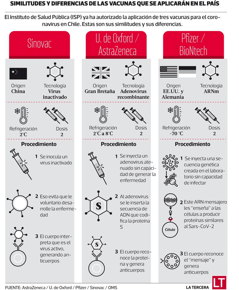 Desde abril próximo y a esperas de lo que ocurra con las pruebas de CanSino en el sur del país, Chile tendrá tres vacunas contra el coronavirus: Pfizer/BioNTech y Sinovac, ya disponibles en Chile, y Oxford/AstraZeneca, aprobada este miércoles por el Instituto de Salud Pública (ISP).