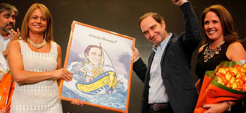 Luego tras ser proclamada como presidenta del partido, la senadora Van Rysselberghe entregó una caricatura como regalo de agradecimiento por su gestión a Larraín y con un video recordó a algunas figuras del gremialismo como Joaquín Lavín, Pablo Longueira y Jovino Novoa, entre otros.