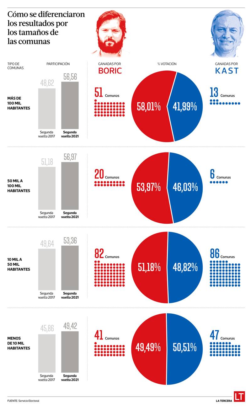 Si se sube un escalón, hasta los 168 municipios que tienen entre 10 mil y 50 mil habitantes, las cifras van variando un poco y se acercan algo más al patrón global, pero todavía con una fuerte distancia. En este grupo participó el 53,36% de los votantes, 3,72 puntos más que en el balotaje de 2017, y Boric logró una leve ventaja contra Kast (954.667 sufragios y el 51,18% de la votación versus 910.704 votos y el 48,82%, una diferencia de 2,36 puntos), pese a que el republicano ganó en 86 municipios del bloque y el presidente electo se impuso en 82.