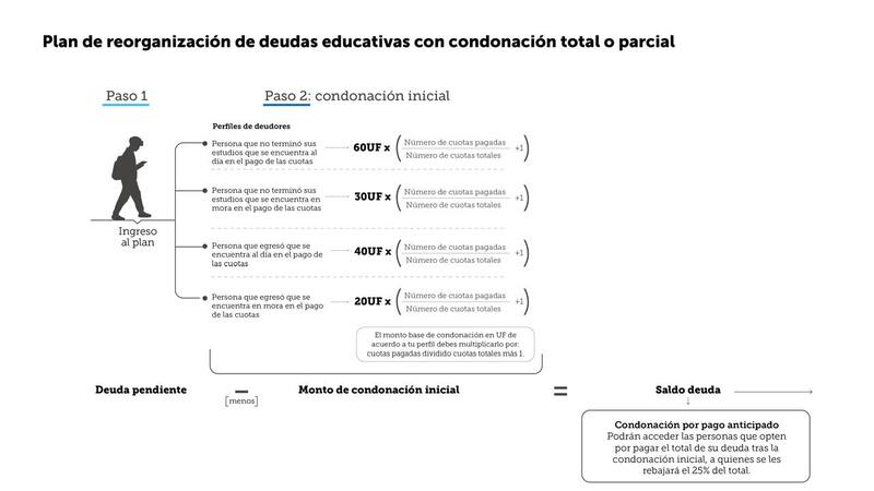 Para esto habrá pasos que dar. Lo primero, evidentemente, es ingresar al plan. Luego cada persona será categorizada en uno de los cuatro perfiles de deudor: desertores con y sin cuotas pendientes, y egresados con y sin cuotas pendientes. Cada uno de esos perfiles tiene un monto base de condonación en UF. En el caso de la persona que no terminó sus estudios y está al día son 60; la persona que no terminó sus estudios y está en mora son 30; la persona que egresó y está al día son 40, y la persona que egresó y está en mora son 20.