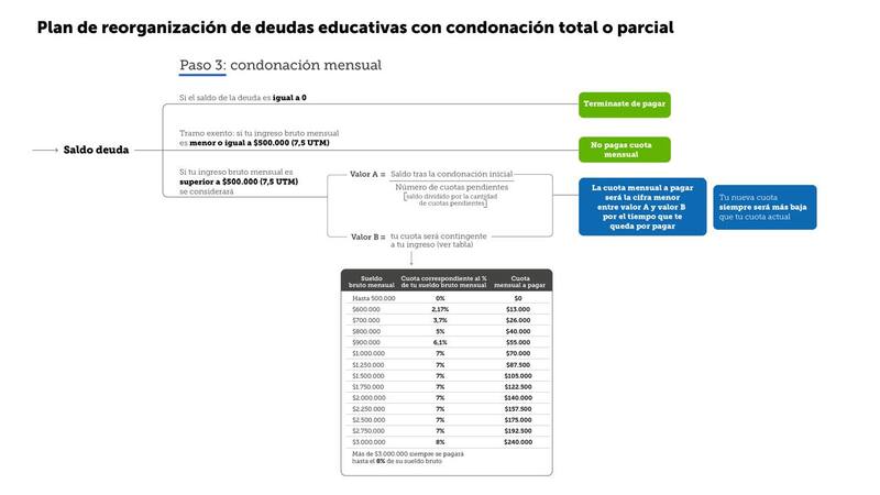 Luego viene el tercer paso y final. Si es que el saldo es igual a cero, la persona automáticamente termina de pagar. Si el ingreso bruto mensual de la persona es menor o igual a $500.000 no se paga una cuota mensual, porque el proyecto establece que quienes ganen menos de 7,5 UTM estarán eximidos de pago, con otros tramos que sí lo hacen.