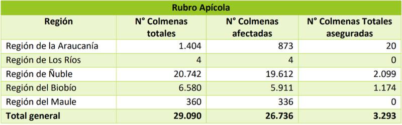 De los apicultores afectados, el 80% estaba inscrito en el Indap, pero tan solo un 12% contaba con seguro agropecuario, por lo que desde el Indap hicieron un llamado para que más personas suscriban la medida.