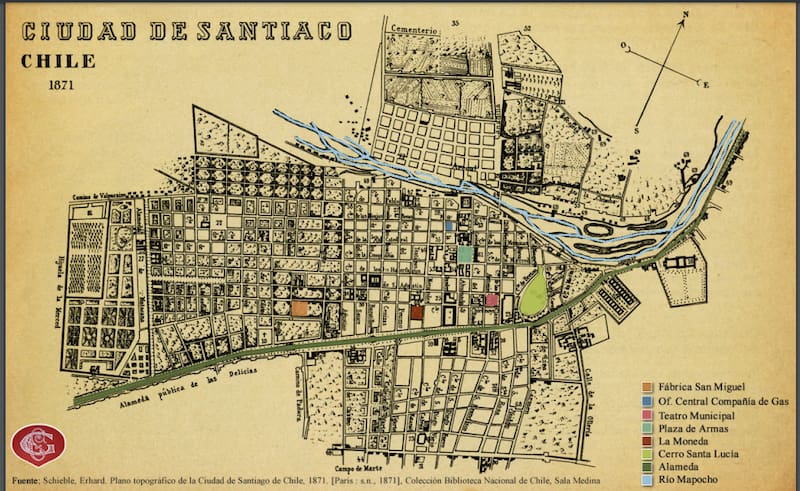 Hace 166 años, el 17 de septiembre de 1857, apenas un año después de que se hubo formado una empresa especial para el cometido, se inauguró el primer alumbrado público a gas en Santiago de Chile, cuando entonces vivían poco más de 100 mil habitantes. El gas abarcaba 272 manzanas e incluía lámparas para el centro de la Plaza de Armas, el centro de la Alameda, las portadas de edificios públicos y las puertas de conventos, monasterios y cuarteles. En total eran 600 luminarias. Con ellas, dice el historiador Armando de Ramón en su libro “Historia de una sociedad urbana”, la capital de la joven República de Chile dejaba atrás los velones, que habían impregnado las noches santiaguinas de “una suerte de tristeza” y alimentado “la propagación se supersticiones”.
