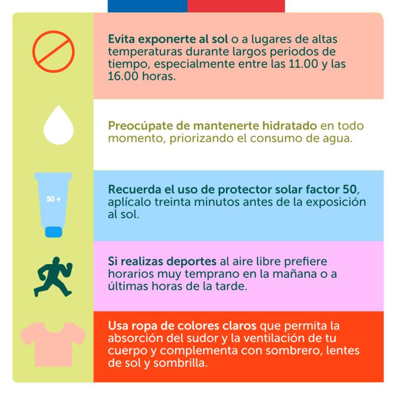 Desde el Ministerio de Salud (Minsal) entregaron recomendaciones ante las altas temperaturas, las cuales son: evitar exponerse al sol durante largos períodos de tiempo, especialmente entre las 11:00 a 16:00 horas; mantenerse hidratado, priorizando el consumo de agua; usar protector solar, idealmente factor 50 y aplicarlo 30 minutos antes de exponerse al sol; usar ropa de colores claros, complementando con sombrero, lentes de sol y sombrilla; y si quiere realizar deportes, se recomienda salir durante la mañana o a últimas horas de la tarde.
