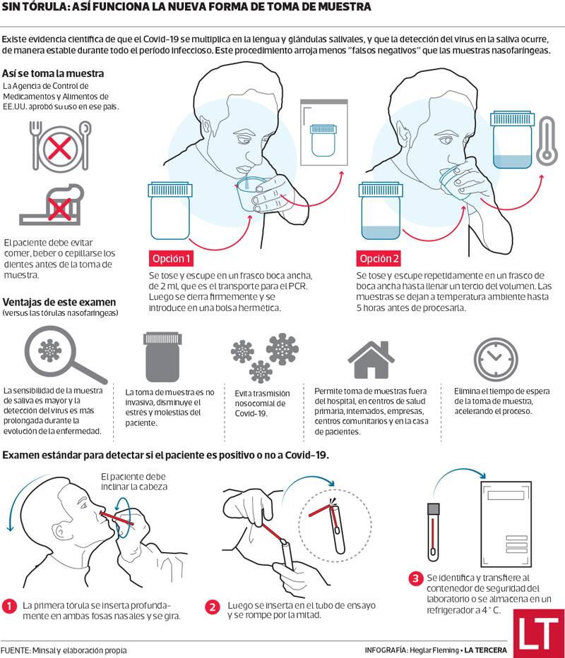 El Consejo Asesor del Ministerio de Salud recomendó a la cartera implementar el examen con muestras de saliva el pasado 31 de mayo. En la minuta del comité se detalla que existe evidencia generada por estudios internacionales respecto de que el virus Covid-19 se multiplica en las glándulas salivales y la lengua. Además, indica ese documento, el virus “puede ser detectado durante todo el periodo que dura la infección” y las pruebas generarían menos falsos negativos que el test que se efectúa hoy.
