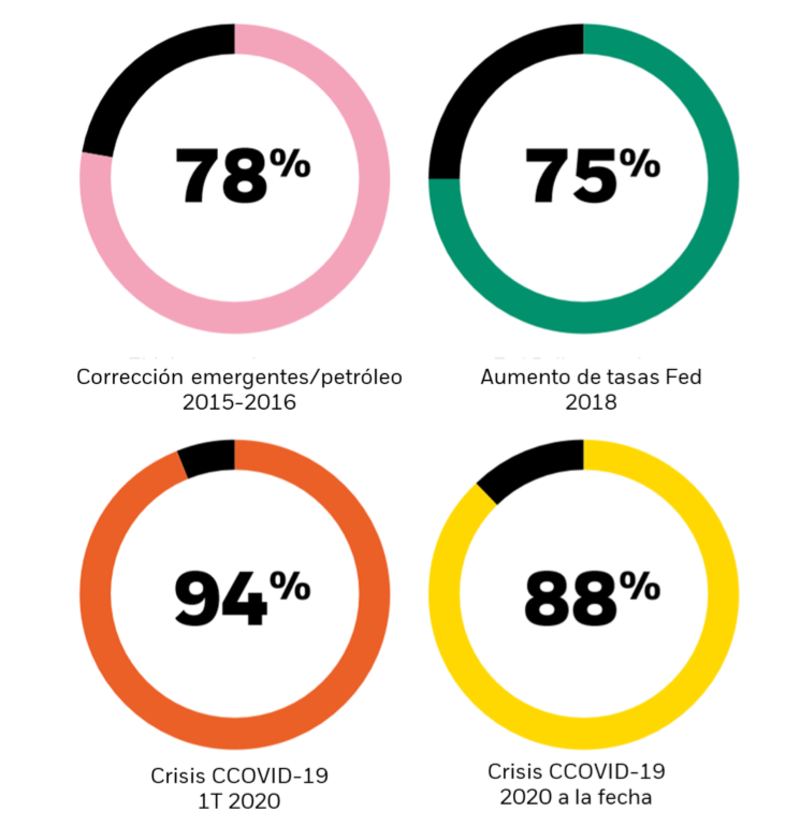 Los mercados financieros globales rápidamente reflejaron la gravedad de la crisis desencadenada por la pandemia, incluso antes de que gran parte del mundo iniciara sus confinamientos. Las acciones comenzaron a ver una pronunciada caída a finales febrero y, en el transcurso de un mes, algunos mercados bursátiles cayeron más de 30%. Al mismo tiempo que los inversionistas buscaban refugio en activos de bajo riesgo, la actividad económica se detenía cuando muchas empresas se vieron forzadas a cerrar y los gobiernos les indicaban a las personas que se quedaran en sus casas. En medio de este entorno volátil, los inversionistas han procurado entender qué características aportó la resiliencia comparativa al rendimiento de los portafolios, y cómo incorporar estas características en sus propias inversiones.
