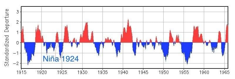 Con la posibilidad concreta de que se registre un nuevo capítulo de La Niña en Chile, Cordero revela que esto ya ocurrió y con características similares hace un siglo, en 1924. Se trata de una desconocida sequía que azotó a Santiago y la zona central hace 100 años debido al fenómeno de La Niña. El evento climático se extendió desde la Región de Valparaíso al Ñuble.