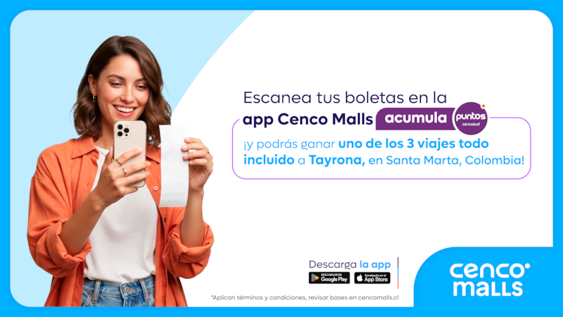 Cenco Malls continúa fortaleciendo la experiencia de quienes visitan sus centros comerciales, incorporando en la App Cenco Malls una nueva funcionalidad que permite escanear boletas de compras presenciales para acumular Puntos Cencosud y, adicionalmente, participar por distintos premios.