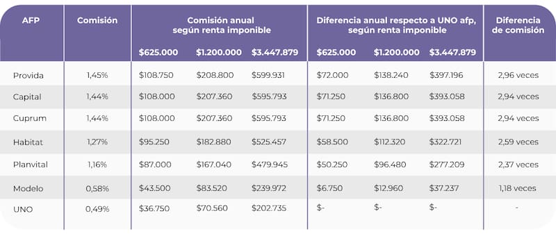 UNO afp cobra solo un 0,49%, la comisión más baja entre todas las AFP de Chile. Por ejemplo, si ganas $1.000.000 al mes, pagarías solo $4.900.