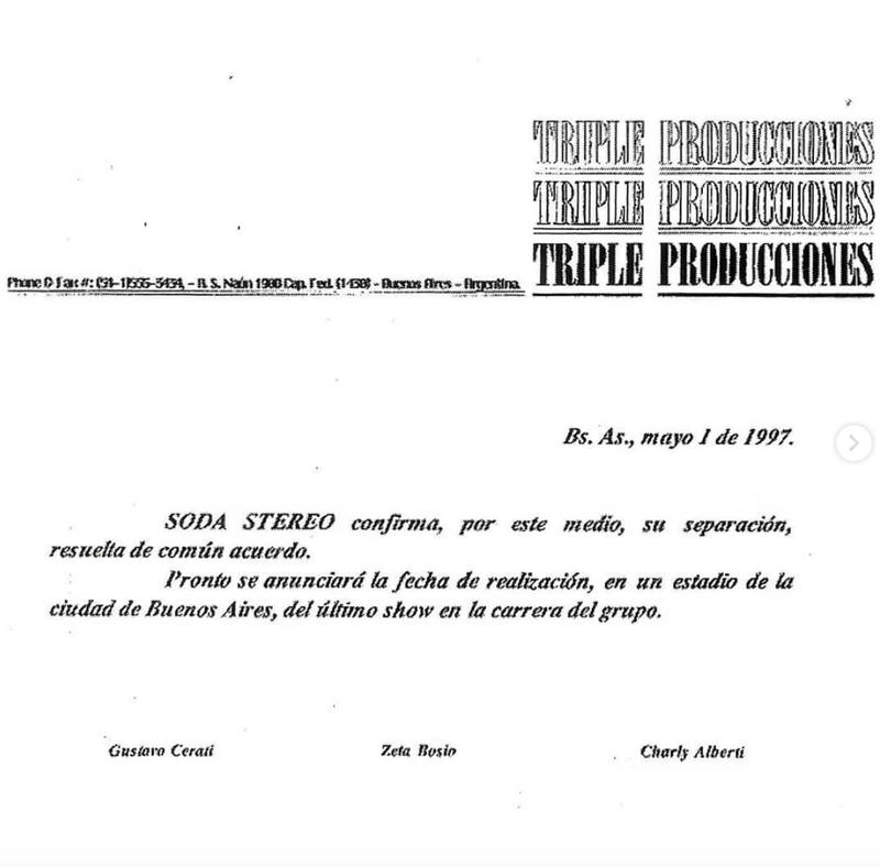 "Soda Stereo confirma su separación, resuelta de común acuerdo. Pronto se anunciará la fecha de la realización en un estadio de la Ciudad de Buenos Aires del último show de la carrera del grupo", así decía el comunicado de prensa emitido en 1997, la peor noticia que los fanáticos de Soda Stereo podían recibir.