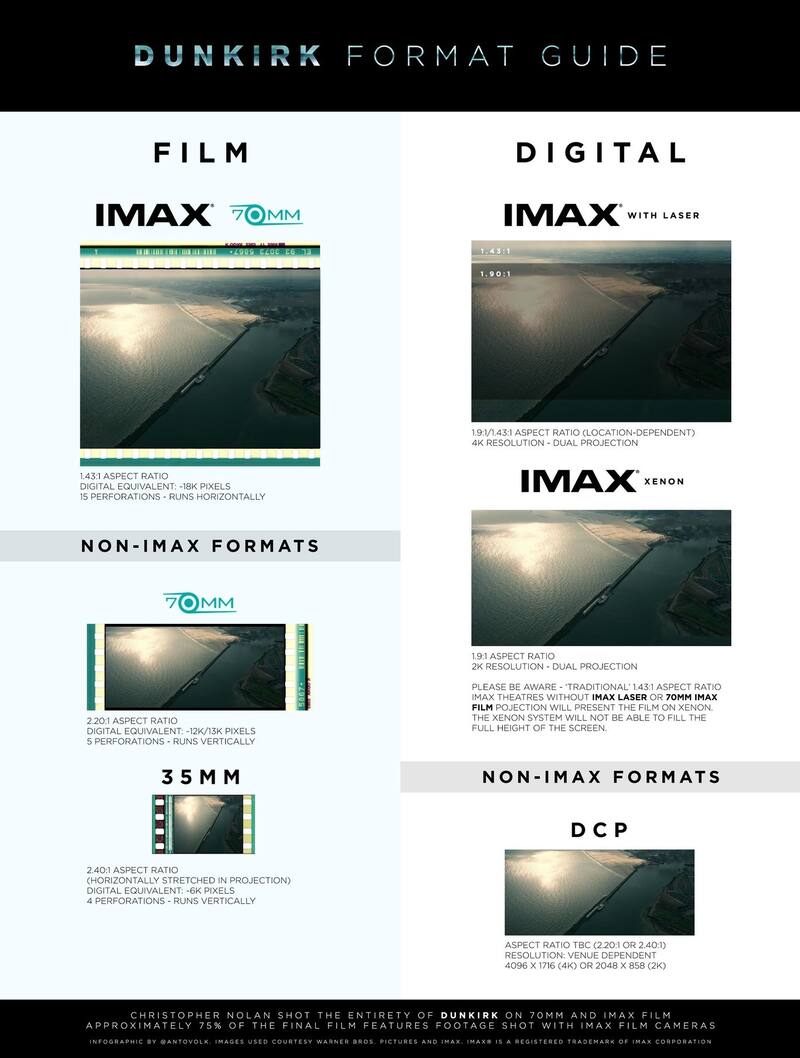 "Teniendo escrito el guión, me senté con mi director de fotografía, Hoyte Van Hoyteman, y hablamos sobre qué formato funcionaría. Ya habiendo usado IMAX para Interstellar, lanzamos muchas ideas, como 35mm anamórfico que va muy bien con la naturaleza horizontal de la playa. Pero al final del día, sabíamos cómo usar este formato que era el de más alta calidad para la imagen de cualquier formato visual que se ha inventado", dijo Nolan en entrevista con Little White Lies.