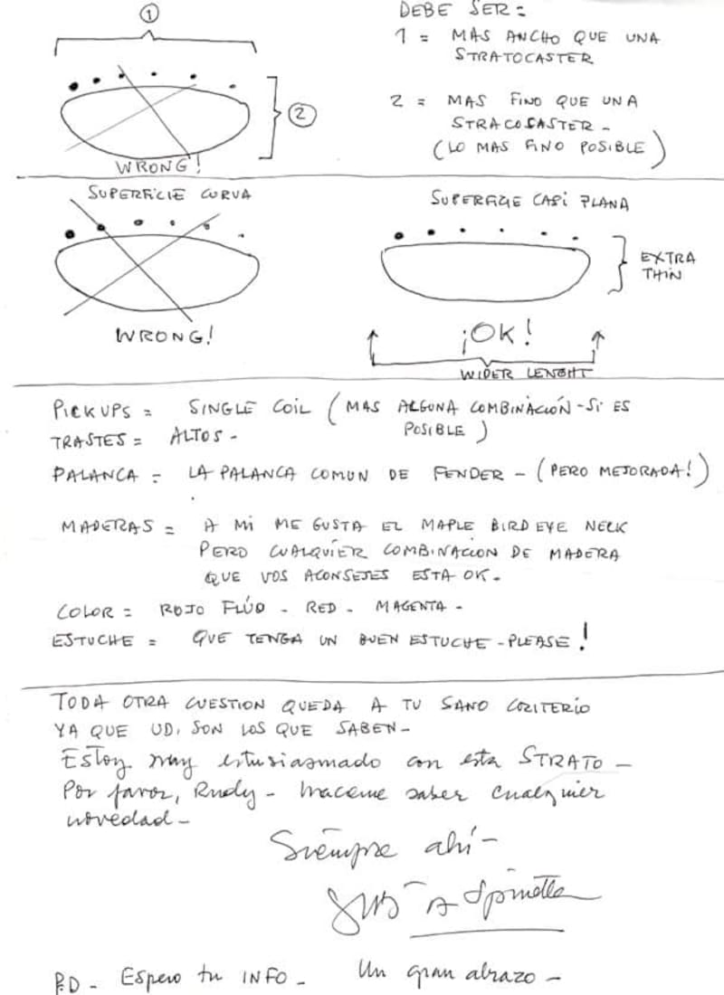 “Toda otra cuestión queda a tu sano criterio, ya que uds. son los que saben. Estoy muy entusiasmado con esta Strato. Por favor, Rudy, haceme saber cualquier duda”, cierra la carta del ícono argentino.