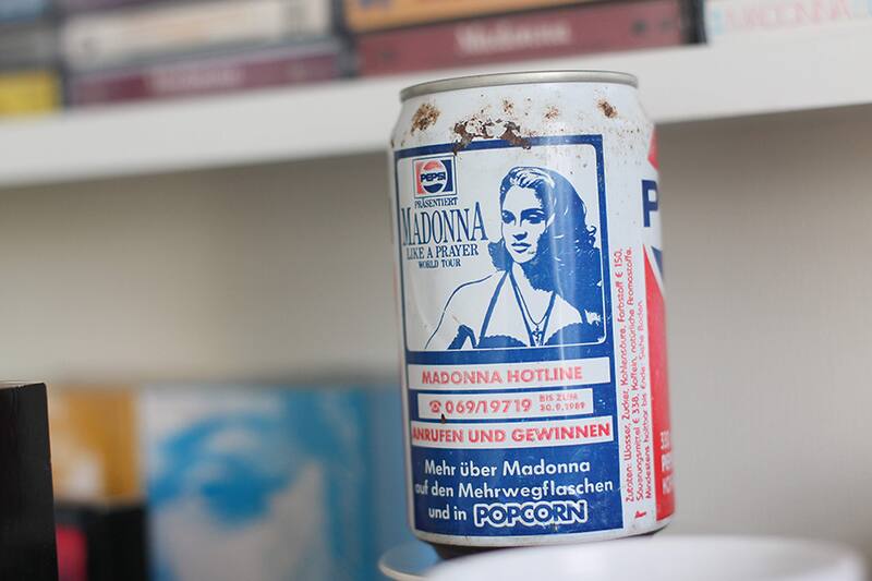Sumado a lo anterior, en la repisa donde coloca sus discos tiene algunas figuras de la cantante, cajas de fósforos con su rostro, tazas de la artista, perfumes y en el centro una lata de Pepsi con la leyenda "Like a prayer world tour", mientras el resto de la bebida tiene textos en alemán.