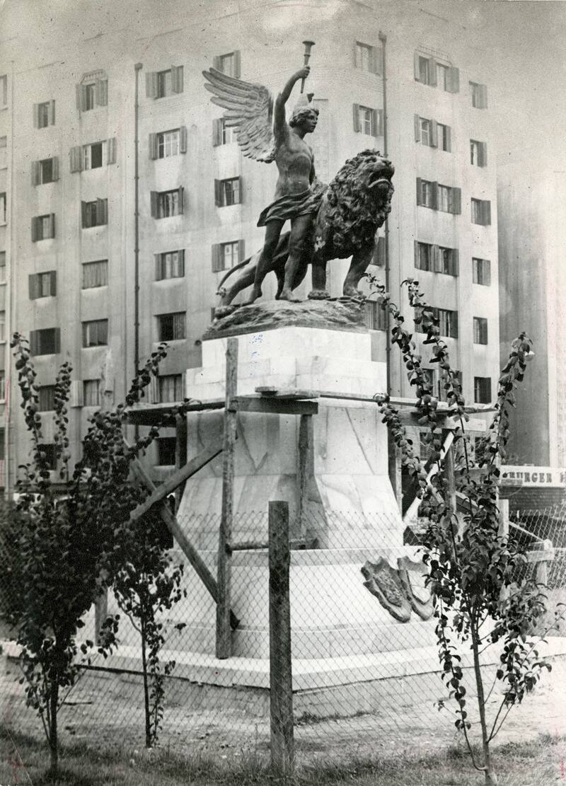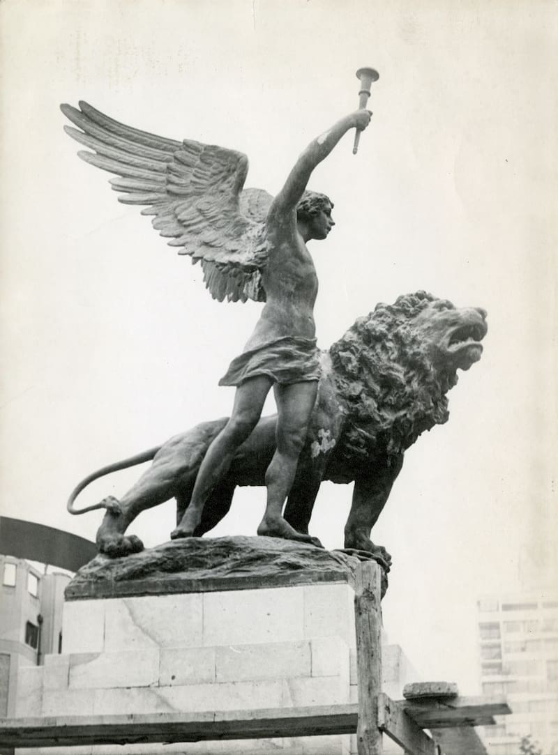 La escultura en cuestión, que puede verse hasta hoy, es el Monumento al genio de la libertad, aunque es más conocido por su forma: El ángel y el león. Fue realizada por un artista italo-argentino, Roberto Negri.