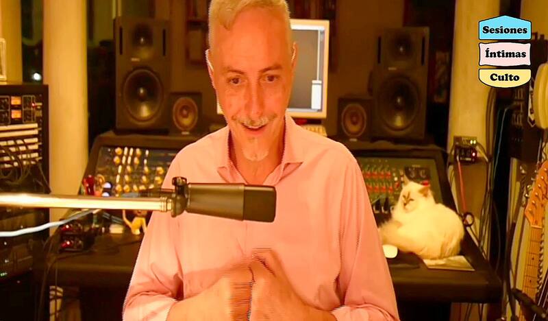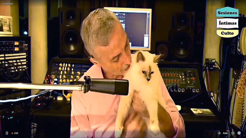 Distante pero cercano. Solo en el estudio de su casa en Buenos Aires, sin productores, intermediarios ni su banda de acompañamiento, pero secundado de su gata Chardonnay (uno de los tres felinos con los que vive, a los que considera “su familia”), un teclado y de una nueva guitarra manufacturada por un luthier amigo que lleva su firma y que luce sin disimular su orgullo.