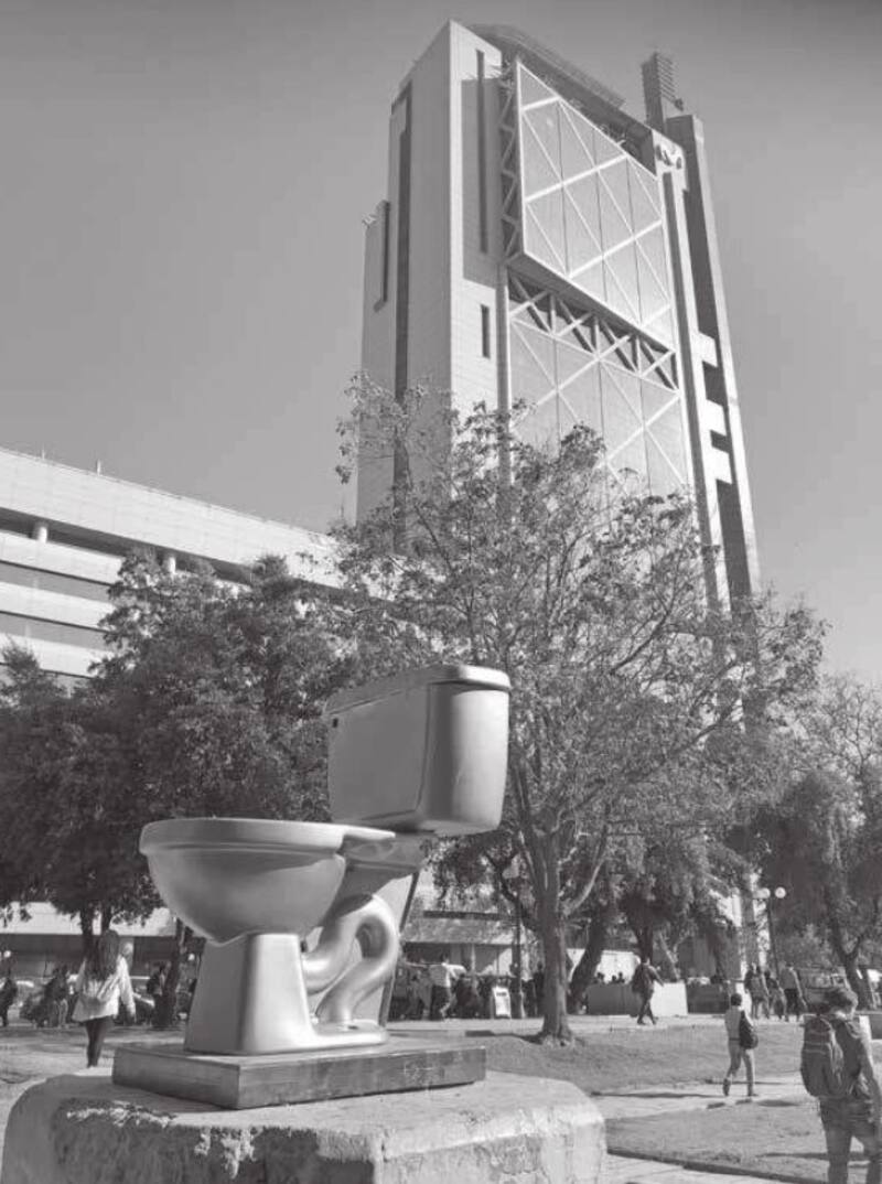 Me detuve a fotografiar un inmenso WC dorado que algún colectivo artístico depositó frente al edificio de la Telefónica. Pude ver a un grupo de exaltados prendiendo una fogata cerca del monumento a Baquedano, pero nada que invitara a la alarma, nada parecido a lo que veríamos horas más tarde, cuando comenzó a oscurecer y fueron quemadas, simultáneamente, nueve estaciones de metro. Setenta y siete de las ciento treinta y seis estaciones que componen la red sufrieron destrozos de diversa magnitud.