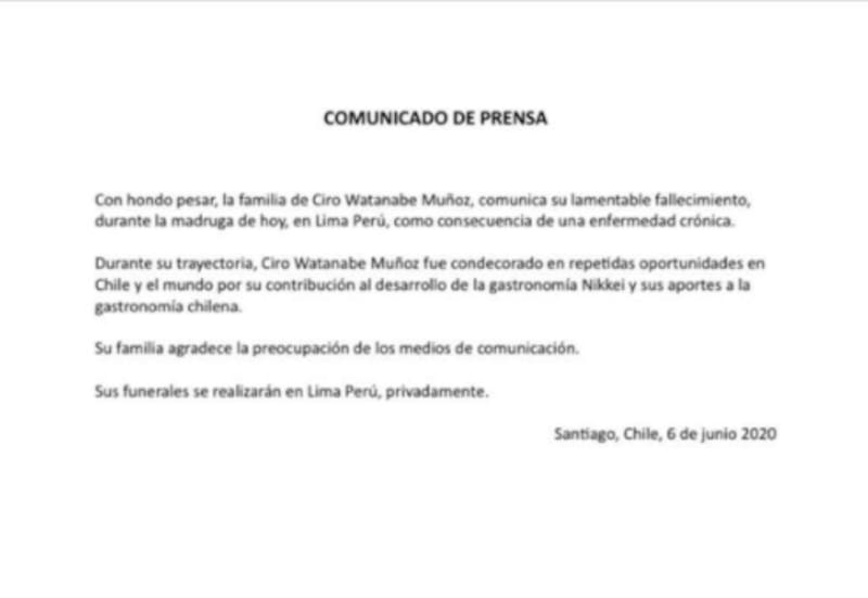 Un comunicado de su familia confirmó la muerte del chef peruano-japonés en la madrugada, "debido a una enfermedad crónica". Exponente principal de la cocina Nikkei, participó en programas como Top Chef y MasterChef, además de ser responsable del servicio gastronómico del restaurant Osaka.