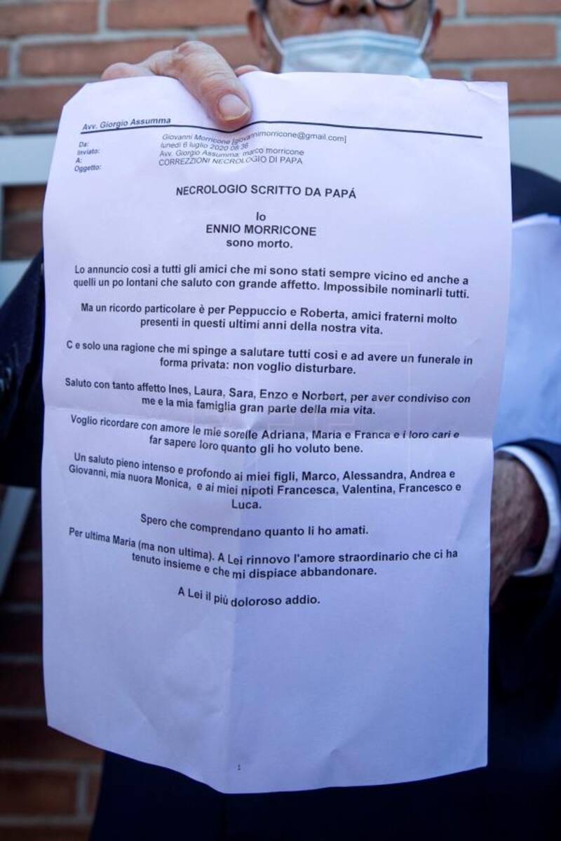 El compositor romano Ennio Morricone, quien falleció hoy a la edad de 91 años, dejó una misiva en la que anuncia su deceso. El documento fue leído por el abogado y amigo del compositor, Giorgio Assumma, quien confirmó su muerte a primera hora a la agencia de noticias ANSA.