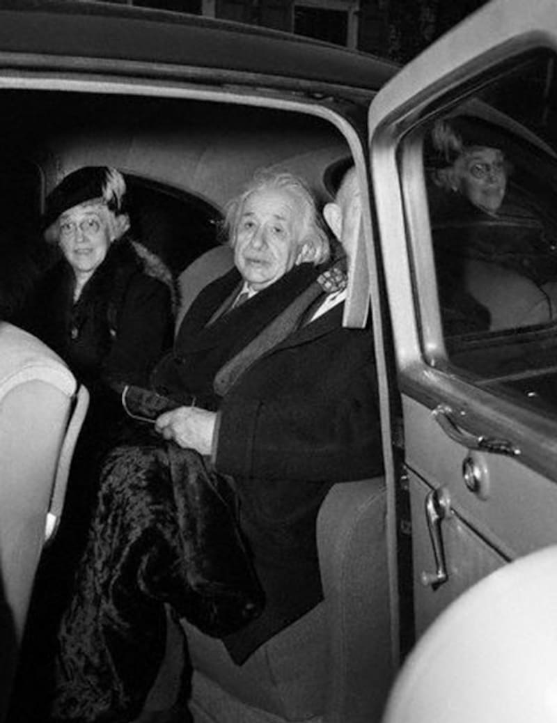 Cuando procedieron a subir al auto, una horda de reporteros insistieron y pelearon entre sí para obtener una imagen del famoso científico, pero solo uno lo logró.