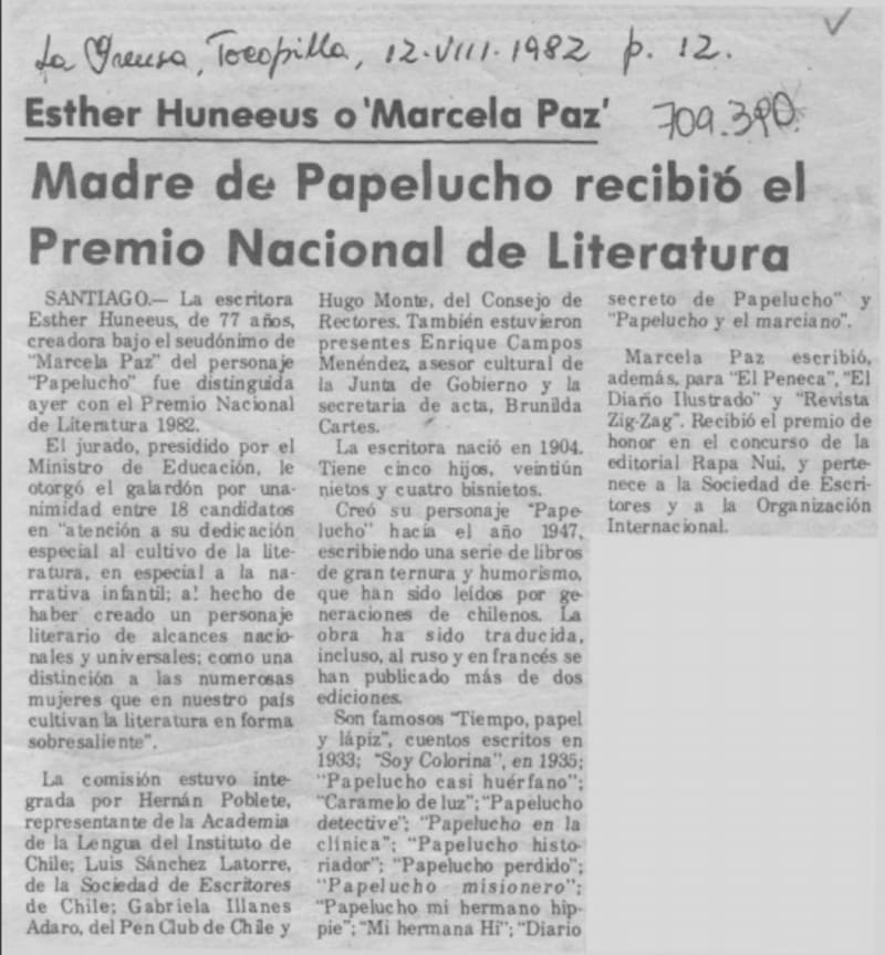 Hacia el final de su vida, en 1982, Marcela Paz recibió el Premio Nacional de Literatura. Es una de las cinco mujeres (entre ellas, solo una poeta: Gabriela Mistral) que han recibido el galardón en sus casi ochenta años de historia. En ese período final, en que publicó otros textos como Perico trepa por Chile (junto a Alicia Morel), y Los pecosos, la autora reveló que estaba trabajando en otro personaje, esta vez una niña, pero su muerte dejó trunca la idea.