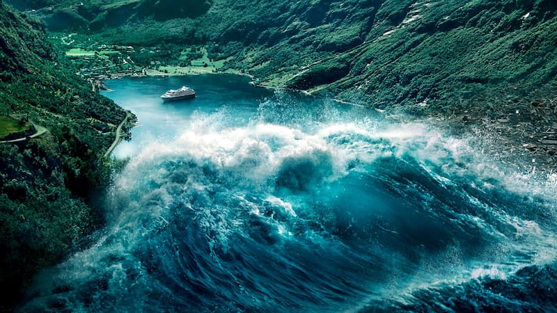 En 2015, el director Roar Uthaug ficcionó cómo sería hoy, en un fiordo noruego a orillas del pequeño poblado de Geiranger, de poco más de 250 personas, una terrorífica ola de 85 metros.