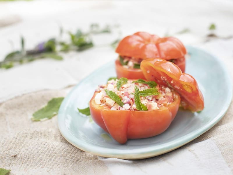 Ahuecar un tomate y mezclar su pulpa con mayonesa, choclo y cilantro. Salpimentar a gusto y rellenar el tomate con esta mezcla. Servir frío sobre una cama de lechuga y decorar con huevo duro.