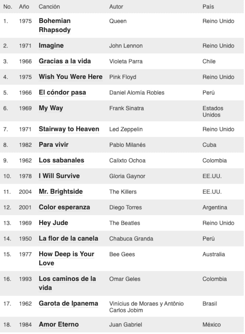 La tercera posición, en tanto, la ocupa la chilena Violeta Parra con su composición “Gracias a la vida”. Y no es la única artista que representa a Chile en este listado.