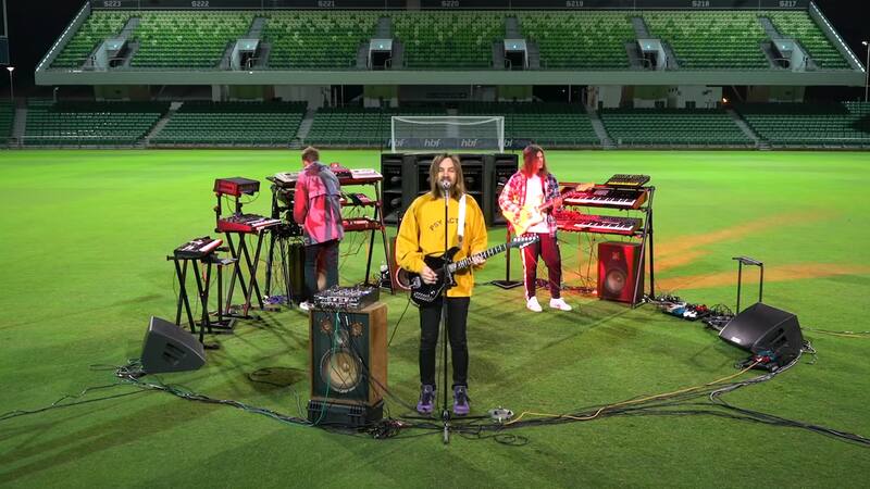 Kevin Parker, vestido con un llamativo polerón amarillo, junto a dos de sus compañeros se ubicaron en el centro del estadio HBF Park en Perth, Australia. Ahí, rodeados de miles de asientos vacíos, interpretaron la icónica “Elephant” —del impecable Lonerism— e “Is It True” del último disco lanzado el pasado 14 de febrero, The Slow Rush.
