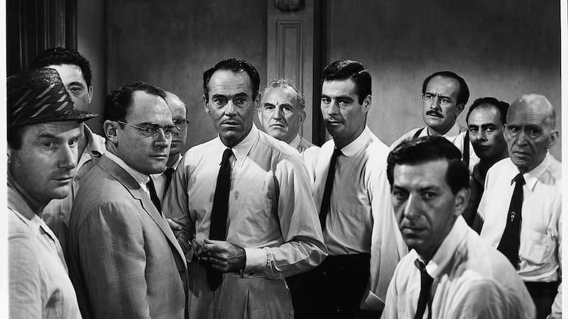 Sólo un integrante del grupo, el jurado 8 (Henry Fonda), duda de su culpabilidad. Las palabras de los testigos (una mujer que dice haber visto el crimen por la ventana y un anciano que asegura haber escuchado la reyerta) le parecen pruebas discutibles También le parece floja la acción del abogado defensor. Aunque no está seguro de la inocencia del muchacho, se plantea algo que nadie en esa sala: si van a mandar a alguien a la cámara de gas, al menos sus eventuales verdugos podrían tomarse una hora en discutirlo.