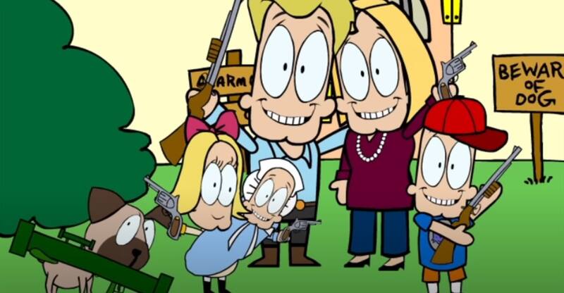 El cortometraje animado de Michael Moore finaliza en un suburbio poblado de blancos, quienes habían construido casas con alarmas, rejas y cámaras. La escena final es una familia que sonríe frente a la cámara mientras hacen un asado: todos están armados, incluso el bebé que sostiene un revólver y la mascota, un pequeño perro que carga una bazuca sobre su hombro.