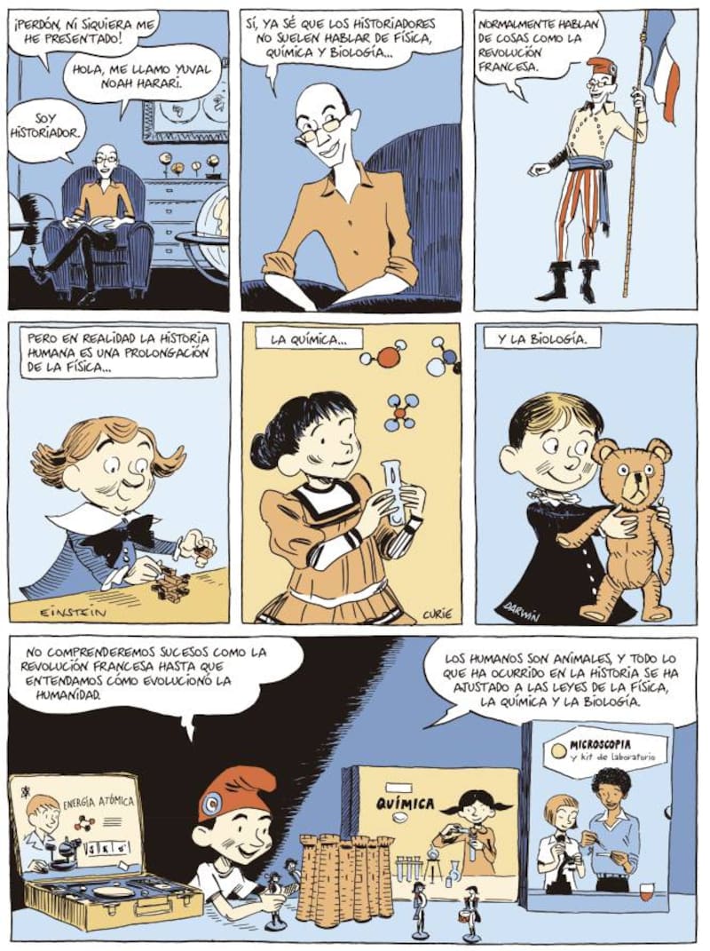Vegano y budista, la figura delgada del historiador recibe al lector en las primeras páginas. Sentado en un sillón y con un libro entre las manos, el académico será el guía en la lectura del cómic. “Hola, me llamo Yuval Noah Harari. Soy historiador”, dice. “Sí, ya sé que los historiadores no suelen hablar de física, química y biología. Normalmente hablan de cosas como la Revolución Francesa”, prosigue. “Pero en realidad la historia humana es una prolongación de la física… la química… y la biología”, añade en viñetas donde aparecen Einstein, Marie Curie y Darwin dibujados como niños. “No comprenderemos sucesos como la Revolución Francesa hasta que entendamos cómo evolucionó la humanidad”.