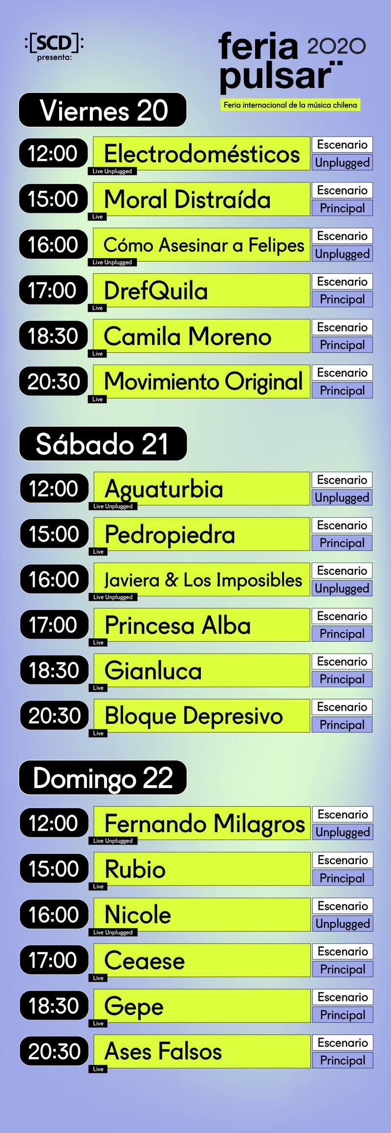 Artistas como Camila Moreno, Cómo Asesinar a Felipes, DrefQuila y Movimiento Original son los protagonistas de hoy, mientras que entre el sábado y el domingo se presentarán otros como Pedropiedra, Bloque Depresivo, Gepe, Nicole y Ases Falsos.