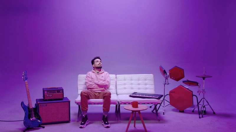 En medio de una sala con luces de colores que cambian constantemente, el actual guitarrista de Chancho en Piedra —banda nominada al Grammy Latino por “Bola de fuego”— toca un instrumento G&L conectado a un amplificador Mesa Boogie Mark V, mientras se intercalan imágenes de cantos y bailes de sus colaboradores.