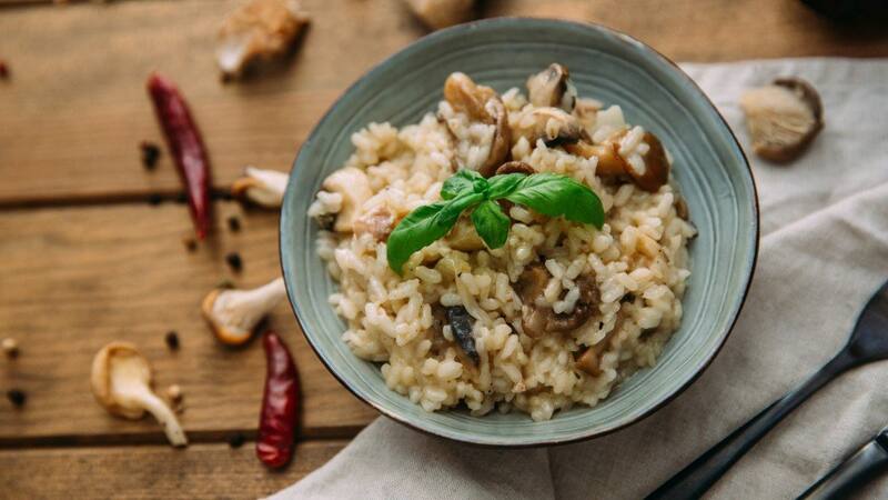 8. Para el risotto, en una olla grande calentar el aceite de oliva. Luego agregar la cebolla y cocinar hasta que esté blanda y transparente. Agregar las hierbas y cocinar por un minuto. Agregar los champiñones y cocinar hasta que estén blandos.