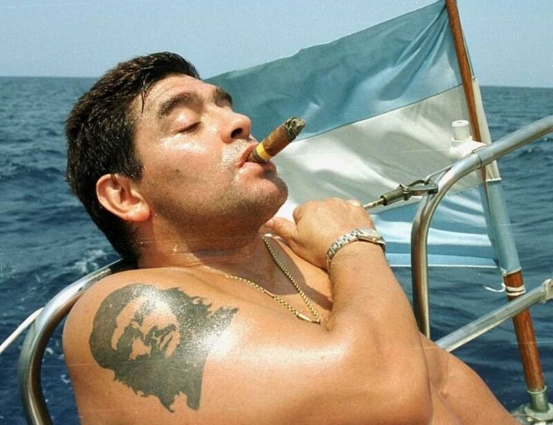 Sebreli plantea que fue en Nápoles y no en Argentina, donde descubrió cómo los símbolos de la guerrilla latinoamericana de los 70 atraían a muchos hinchas del fútbol, aunque “despojados de todo significado político concreto y reverenciados por sus costados de coraje y violencia”. Muchos tifosi usaban boinas con una estrella y poleras con diseños militares. Maradona unió su imagen a la del Che Guevara, vínculo que quedó impregnado en su piel durante un carnaval en Río de Janeiro, cuando se tatuó en un brazo el rostro del guerrillero; y después el de Fidel Castro, líder de la revolución de Cuba, país que “El pibe de oro” visitó por primera vez en 1987.