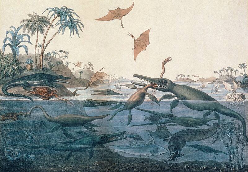 Bestard detiene su respuesta y busca algo en la habitación. Le toma algunos segundos encontrarlo. Es un dibujo que fue hecho por Henry De la Beche, un importante geólogo británico del siglo XIX. En el retrato aparecen distintos animales prehistóricos en un escenario acuático; se distinguen algunas especies como el plesiosaurio, además de cocodrilos y calamares primitivos