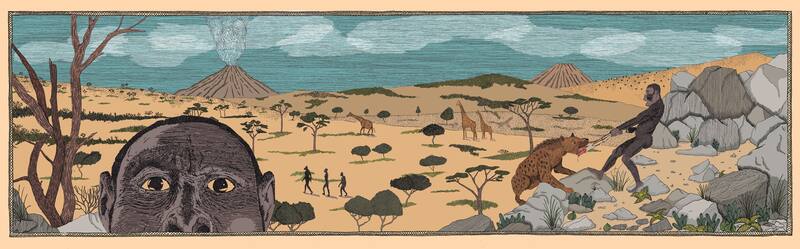 Finalmente, se relata e ilustra la aparición de los primeros homínidos, distintas especies emparentadas con los primates, capaces de caminar sobre dos patas y con gran habilidad en sus manos; uno de estos grupos evolucionó para convertirse en el homo sapiens. En una las últimas ilustraciones del libro, se muestra el rostro de uno estos individuos, como si se hubiera tomado una foto a sí mismo, en medio de la sabana africana: