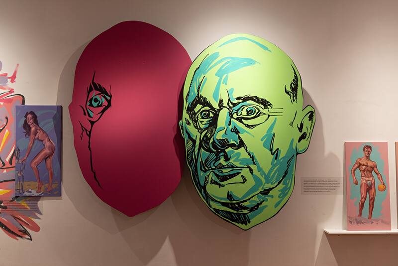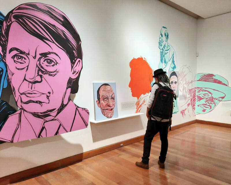 Además de técnicas como el óleo sobre tela, acrílico, esmalte al agua (en muros) y dibujo, Gabler creó figuras recortadas como las que se hacían en los cines hasta los 80. “Es una técnica que era muy común en los cines hasta los años 80”, dice el artista. Las dos figuras centrales, en el centro de la muestra, son emblemáticos villanos: Jaws (o Mandíbula), el asesino con dientes de acero, y OddJob, secuaz de Goldfinger.