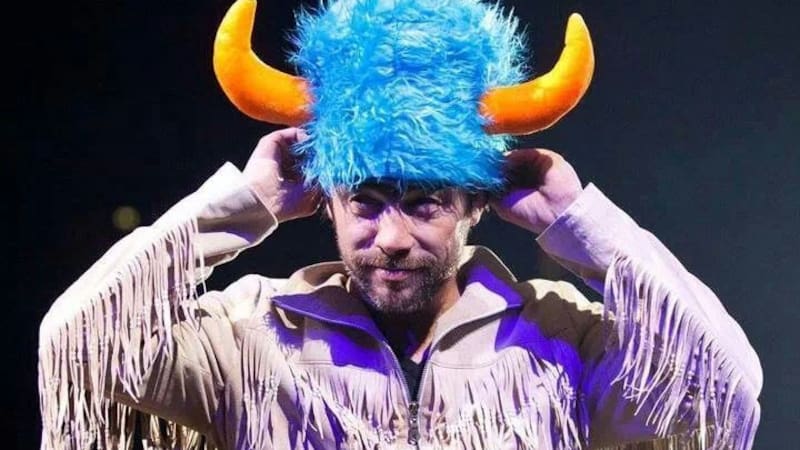 Un hombre con el pecho desnudo y una especie de casco con cuernos y pieles de animales, muy parecido al que el cantante suele usar en sus presentaciones en vivo y en el arte de sus discos.