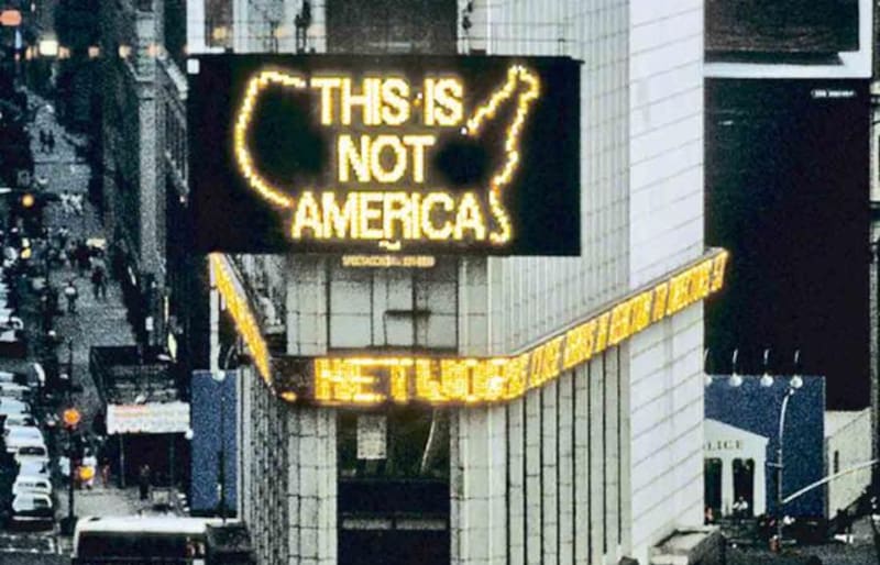 En 1987, un atrevido Alfredo Jaar instaló la que es acaso una de sus obras más conocidas. En medio de la siempre transitada Times Square, en Nueva York, el chileno levantó un fuerte mensaje político donde enfrentaba el patriotismo de los estadounidenses.