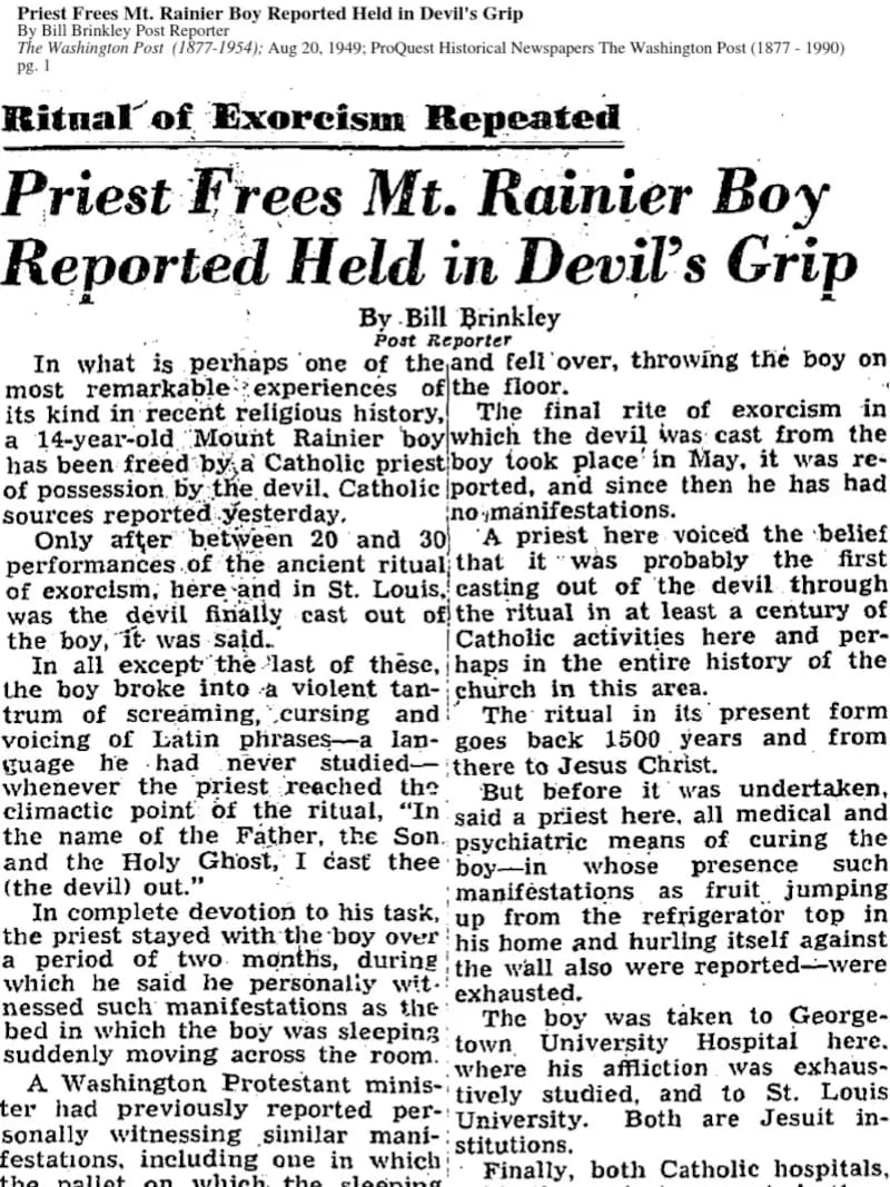“En lo que probablemente es una de las experiencias más notables de su tipo en la historia religiosa reciente, un adolescente de 14 años de Mount Rainier fue liberado por un sacerdote católico de una posesión demoníaca. Reportaron fuentes de la Iglesia Católica el día de ayer”, comenzaba la noticia publicada en el Washington Post el 20 de agosto de 1949.