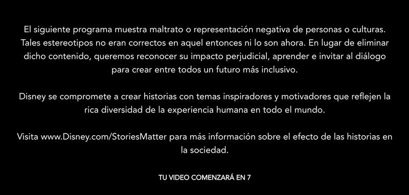 “El siguiente programa muestra maltrato o representación negativa de personas o culturas. Tales estereotipos no eran correctos en aquel entonces ni lo son ahora. En lugar de eliminar dicho contenido, queremos reconocer su impacto perjudicial, aprender e invitar al diálogo para crear entre todos un futuro más inclusivo”.
