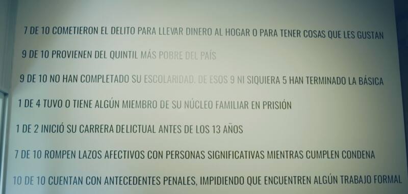 En la exposición se pueden leer algunos conceptos: Uno de dos inició su carrera delictual antes de los 13 años. Uno de cuatro tuvo o tiene algún miembro de su núcleo familiar en prisión. “El 70% rompe sus lazos de amistad o de parentesco mientras cumplen condena por lo que cuando salen, no tienen a dónde acudir”, agrega el artista.