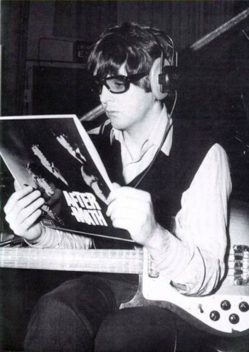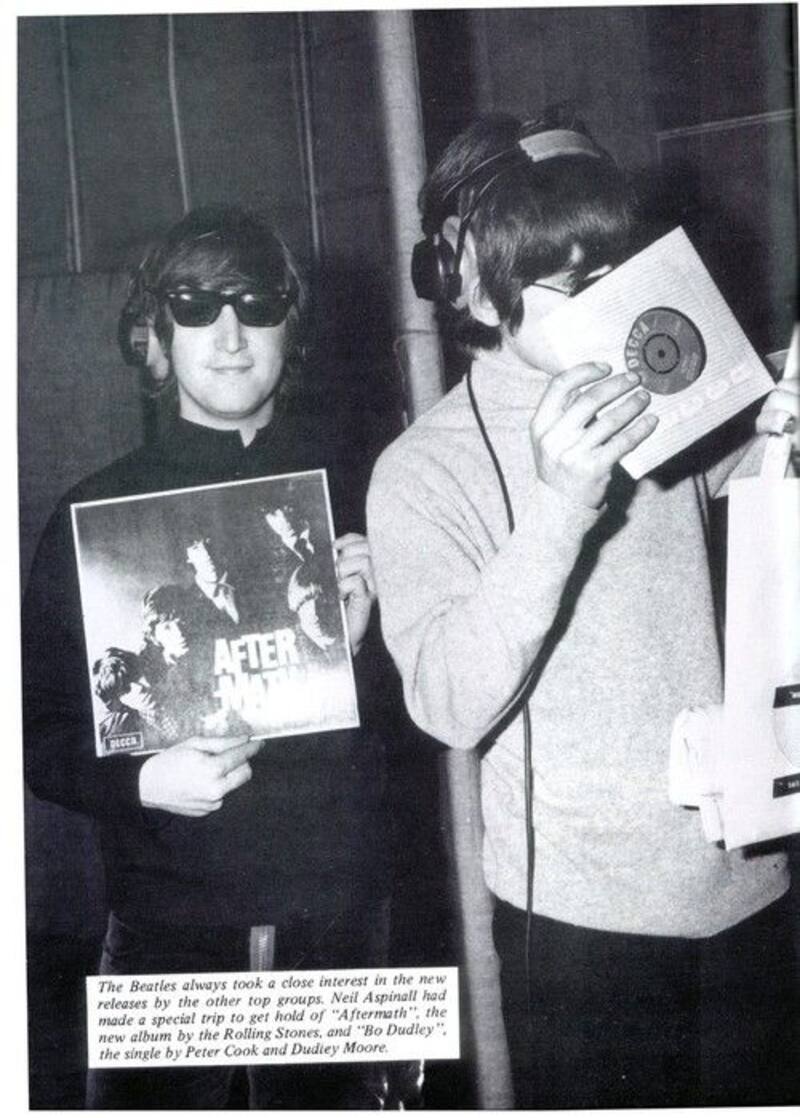 No: la huella de Aftermath se puede empezar a divisar en fotografías de The Beatles. Mientras en la más conocida Paul McCartney aparece de gafas gruesas, audífonos de estudio y bajo Rickenbacker escrutando la contraportada del disco, en otra John Lennon al lado de George Harriosn muestra a la cámara el vinilo con los rostros de Mick Jagger, Keith Richards, Brian Jones y el resto en siniestro tono púrpura, en contrapunto al título en blanco de la producción.