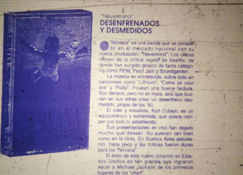 En una reseña fechada el 6 de diciembre de 1992, el suplemento La Escalera de La Tercera incluyó una reseña del cassette de Nevermind, dedicándole también espacio a la figura de Cobain, “un esquizofrénico y extremista que quiere romper con todo lo establecido”, dice la publicación.