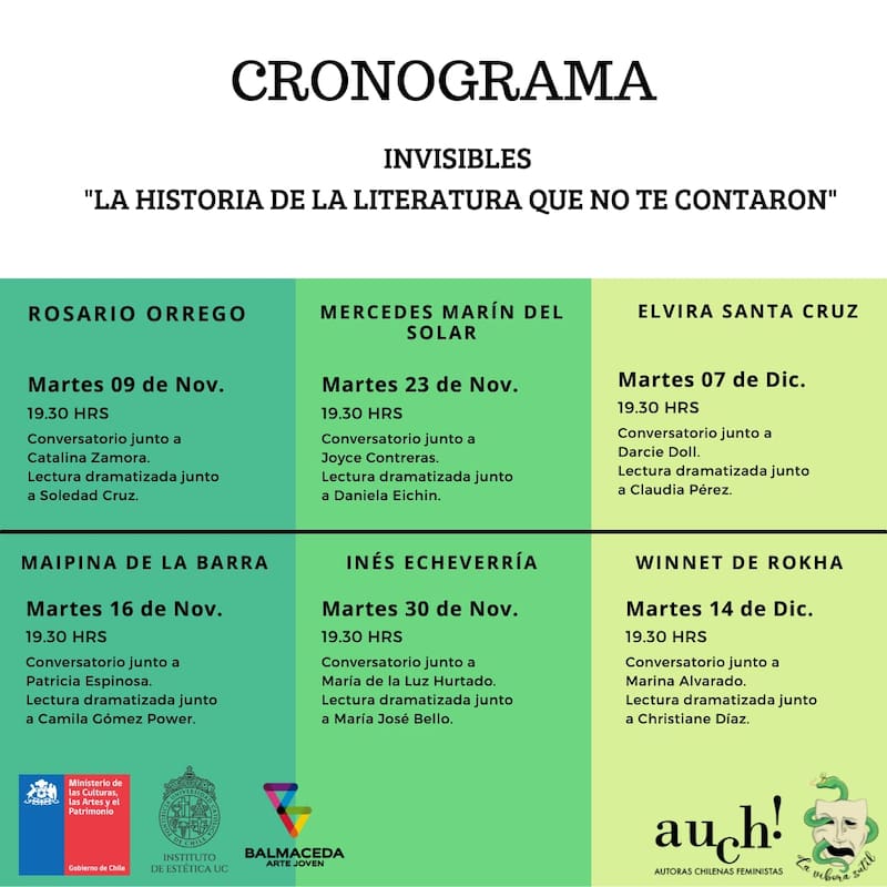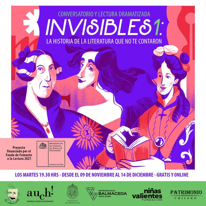 El ciclo, llamado Invisibles, es organizado por la Compañía de Teatro La Víbora Sutil y el Colectivo de Escritoras Feministas AUCHS! y en sus palabras: “Busca incentivar la lectura y generar un espacio de formación y apreciación cultural”. Es financiado por el Fondo de Fomento a la Lectura 2021, y cuenta con el patrocinio del Instituto de Estética de la UC y de Balmaceda Arte Joven.