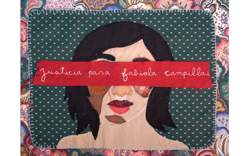 Estábamos haciendo el bordado de su cara y viendo cómo iba a ser el momento en que ella perdía la visión, era algo delicado y emocionante de hacer, de producir ese bordado, de hacerlo. Estábamos en todo este proceso y nace esto de la banda roja que lo vimos también en las redes sociales como una forma de apoyar a Fabiola, de poner una banda roja y mucha gente empezó a usar esa banda como manifestación pública de apoyo para la justicia de Fabiola, como que fue al mismo tiempo que se estaba haciendo la creación que surgió esa idea, entonces ahí fue interviniendo en el proceso creativo las cosas como se iban dando.