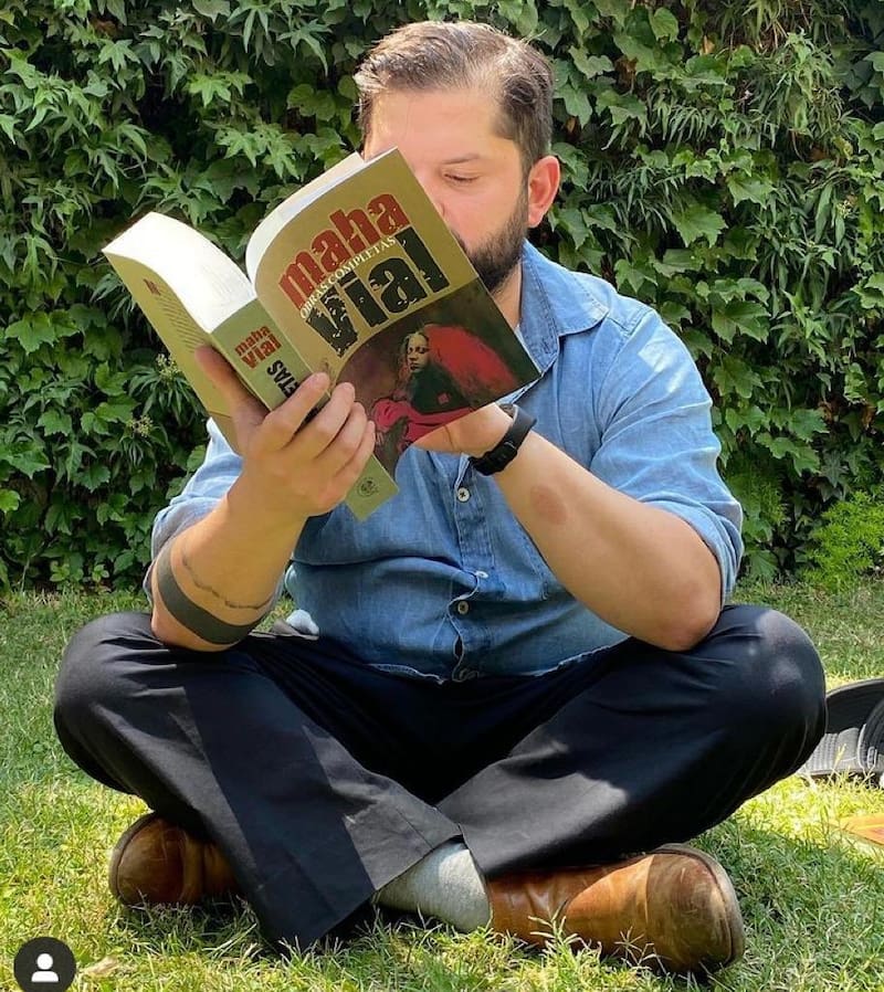 Sin embargo, en esta imagen, Boric aparece inmerso en la lectura de la poeta valdiviana Maha Vial. En rigor, de un volumen que reúne las obras completas de la autora, publicado por Ediciones Kultrún.