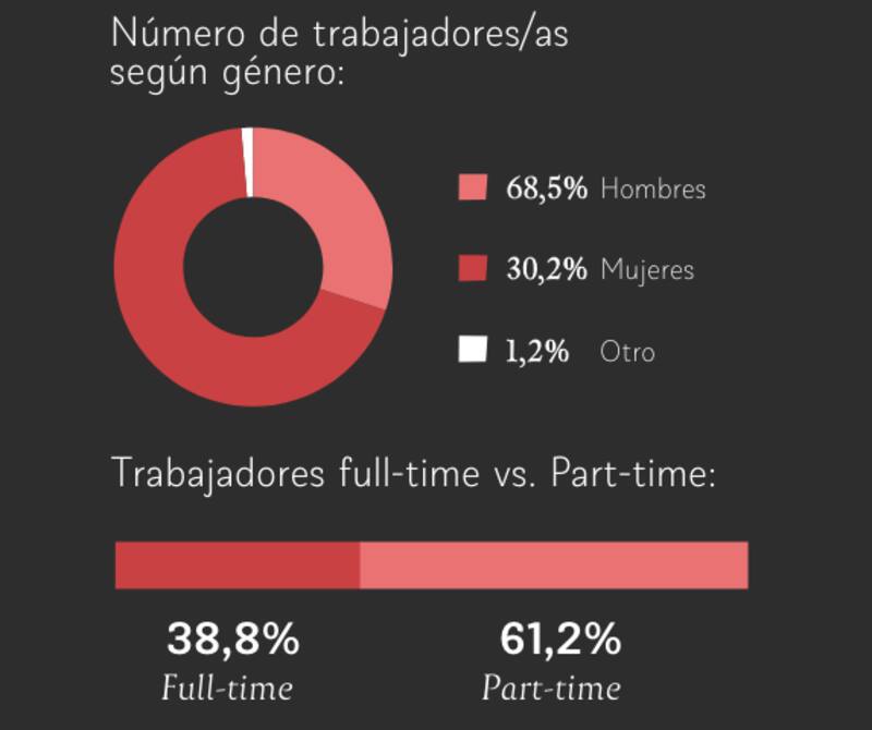 “Muchas veces los bajos sueldos obligan a que los trabajadores tengan que tener segundos ingresos que no están relacionados con esta industria; ser emprendedores o freelancers de otros trabajos para poder mantenerse en estos puestos”, precisa Dañobeitía. Cabe destacar que, de ellos, sólo un 38,8% se dedica full time a sus labores dentro del rubro.